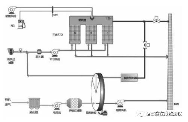 工藝流程主要由沸石轉輪濃縮(吸附區域、脫附區域、冷卻區域)、脫附系統、蓄熱式燃燒系統(RTO爐體、陶瓷蓄熱體、燃燒系統等)及控制系統等部分組成。